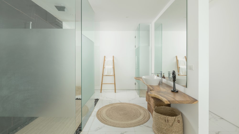 - Ensuite bathrooms highlight stylish design elements such as striking single-slab suar wood countertops