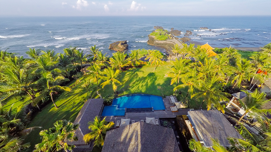 Sohamsa Ocean Estate overlooks a magical sea temple crowning a dramatic outcrop of black volcanic rock on Bali’s south-west coast.