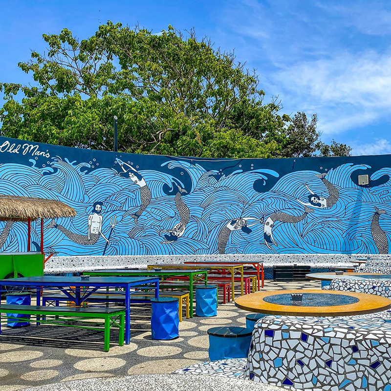Aussie artist Lucas Grogan added funky vibes to Old Man’s with his signature blue murals, which act as a magnet for curious kids and art savvy adults.