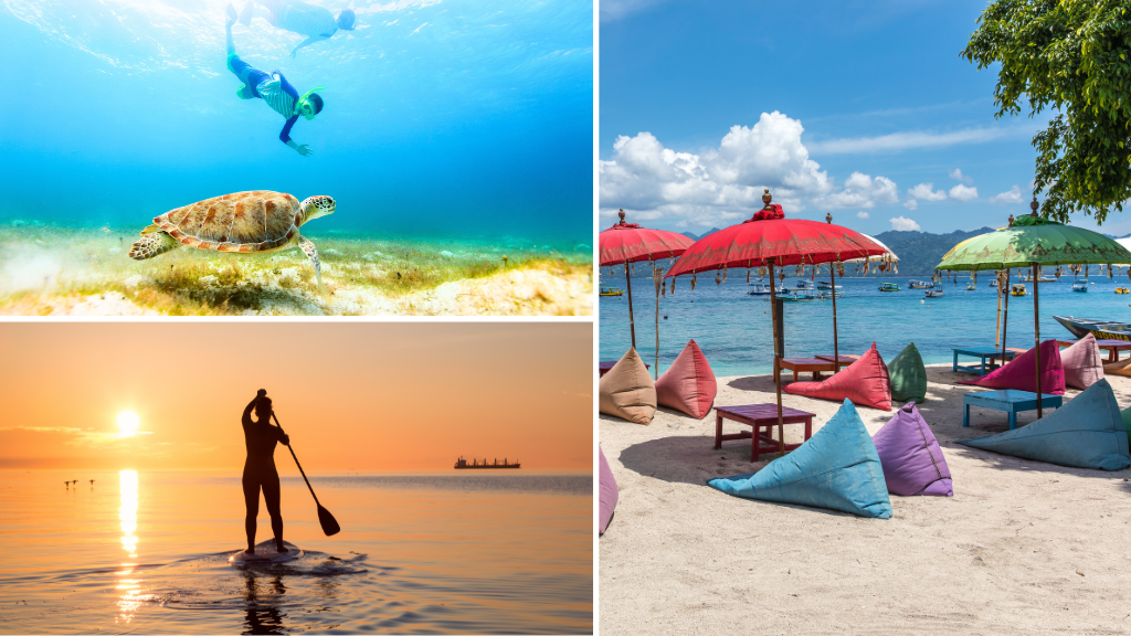 After an easy pick-up, start with a gentle snorkel off Gili Air, where turtles graze in shallow, glassy water. It’s an ideal spot for children and beginners under a guide’s watchful eye. Continue to Gili Meno’s famous ‘Nest’ sculptures before the Bali crowds arrive, drifting above coral-covered figures that make for an imaginative underwater scene. By late morning, pause on any of the Gili’s beautiful beaches for coconuts, sandcastles, or a spin on stand-up paddleboards.