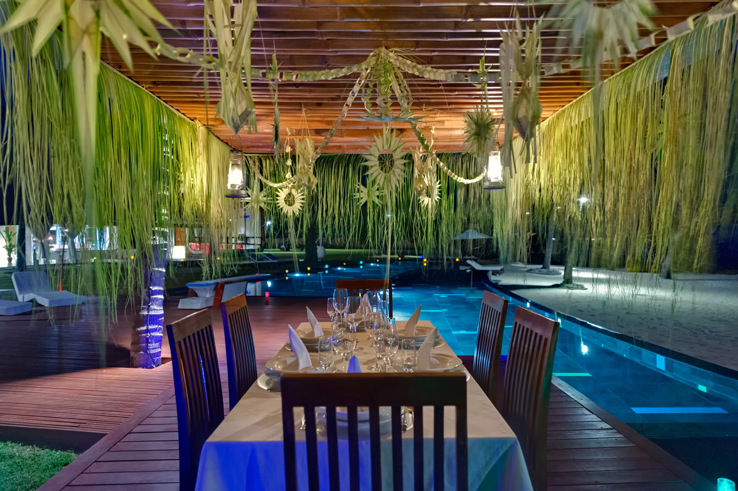 Visual delights unfold at each step across the white stone steps traversing the koi pond at The Anandita. A commanding sandstone screen offers snippets of the spectacular garden that stretches beyond the entertainment deck and swimming pool, to the private Sira Beach. With acres of space and four bedrooms, The Anandita is another fabulous tropical island wedding venue to consider.